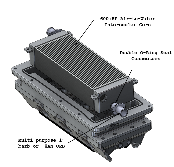 - Integrated air to water intercooler system with a 600hp core that bolts into the housing so it can easily be replaced if ever damaged. These cores are of the highest quality manufactured in the USA!